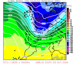 El espesor entre 1.000 y 500 milibares tiene la temperatura media de la columna de aire entre 1.000 y 500 milibares. Por ejemplo, el espesor de 5.458 metros equivale a a 5.458/20 = 273 grados Kelvin o sea 0º centígrados. El espesor de 5.280 metros equivale a 5.280/20=267,5 grados Kelvin, osea, 267-273 = -5,5 º grados centígrados. Hemos averiguado la temperatura entre 1.000 y 500 milibares. La temperatura -5,5º centígrados es una irrupción de aire frío.